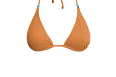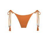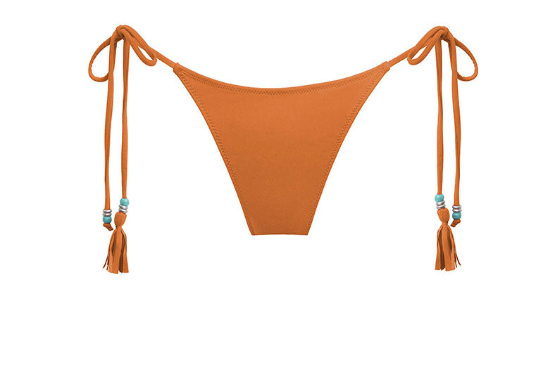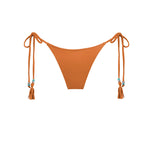 Tie-side bikini bottom in soft orange faux suede. Ruched at the mid-back. Featuring antique silver and turquoise details at the front, and finished with a handmade fringe. Ties are adjustable at the sides with laces.
