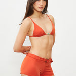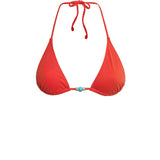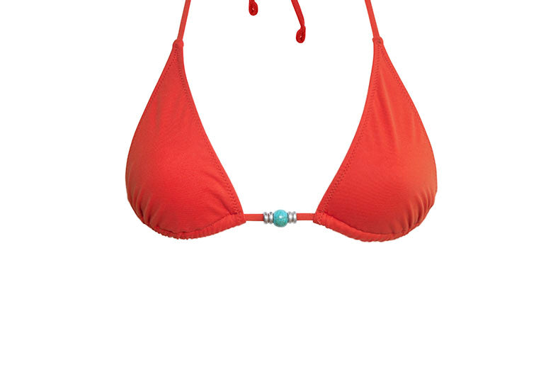 Triangle bikini top in soft red faux suede. Featuring antique silver and turquoise details at the center, and handmade fringe at the back.